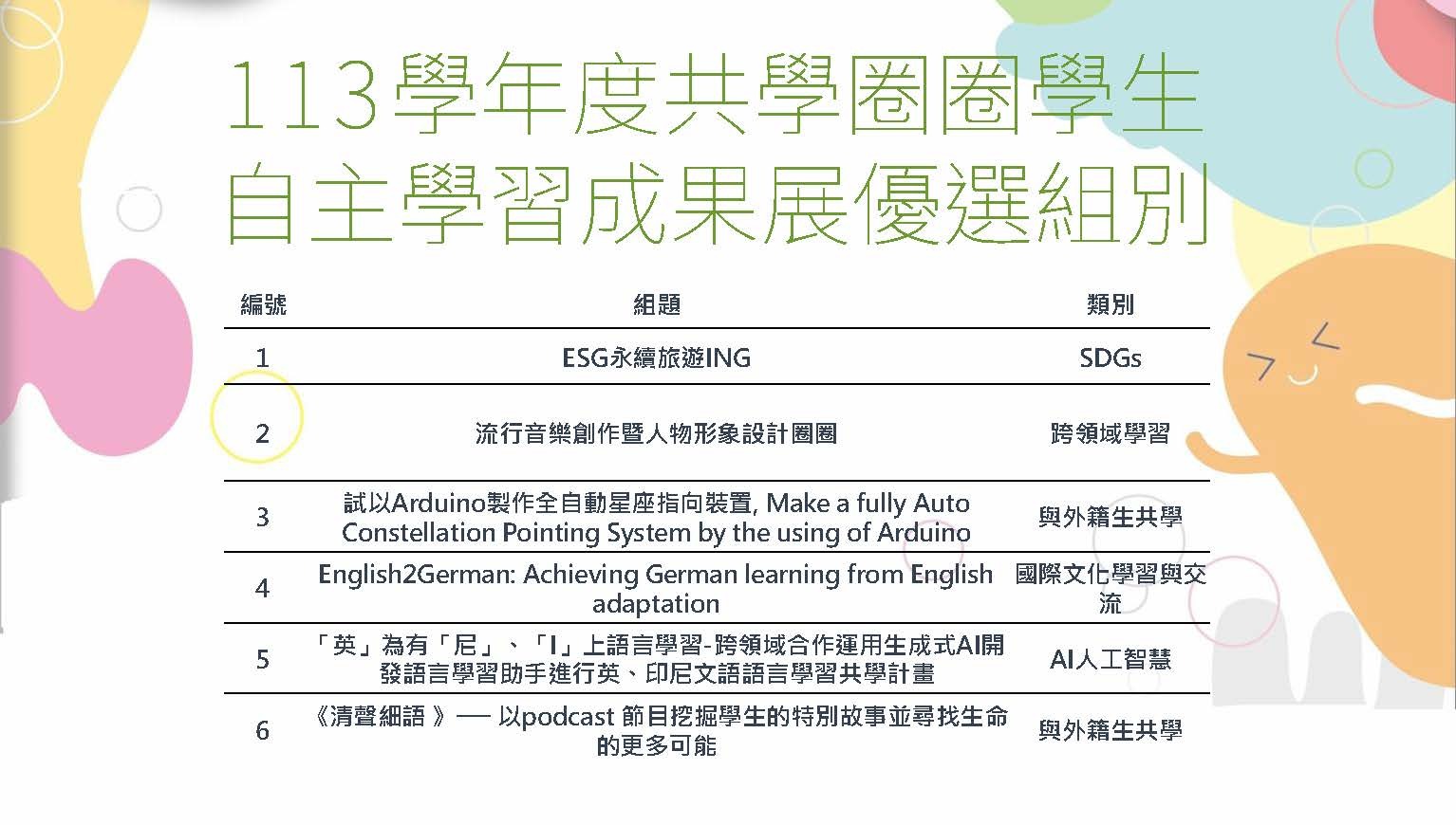113學年度共學圈圈學生自主學習成果展優選組別 Selected Outstanding Groups – 2024 Co-Learning Circle Student Achievement Showcase