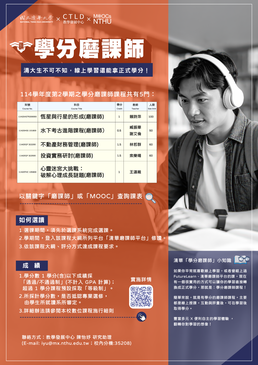 聯絡方式:教學發展中心 陳怡妤研究助理 (E-mail: iyu@mx.nthu.edu.tw;校內分機:35208)