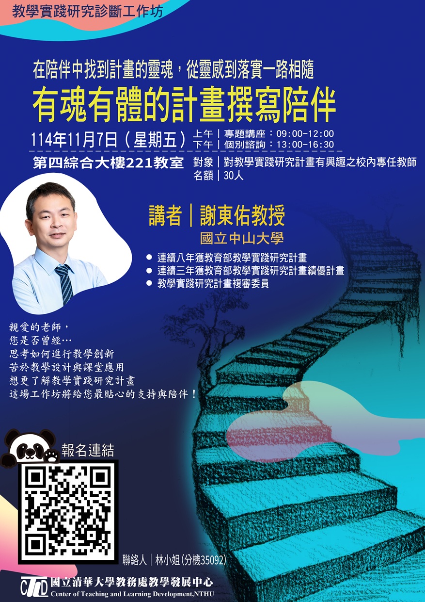 謝教授連續8年拿到教學實踐研究計畫(並有3年獲績優計畫),並為教學實踐研究計畫複審委員,邀請您參與從不同面向切入,在陪伴中找到計畫的靈魂,從靈感到落實一路相隨!