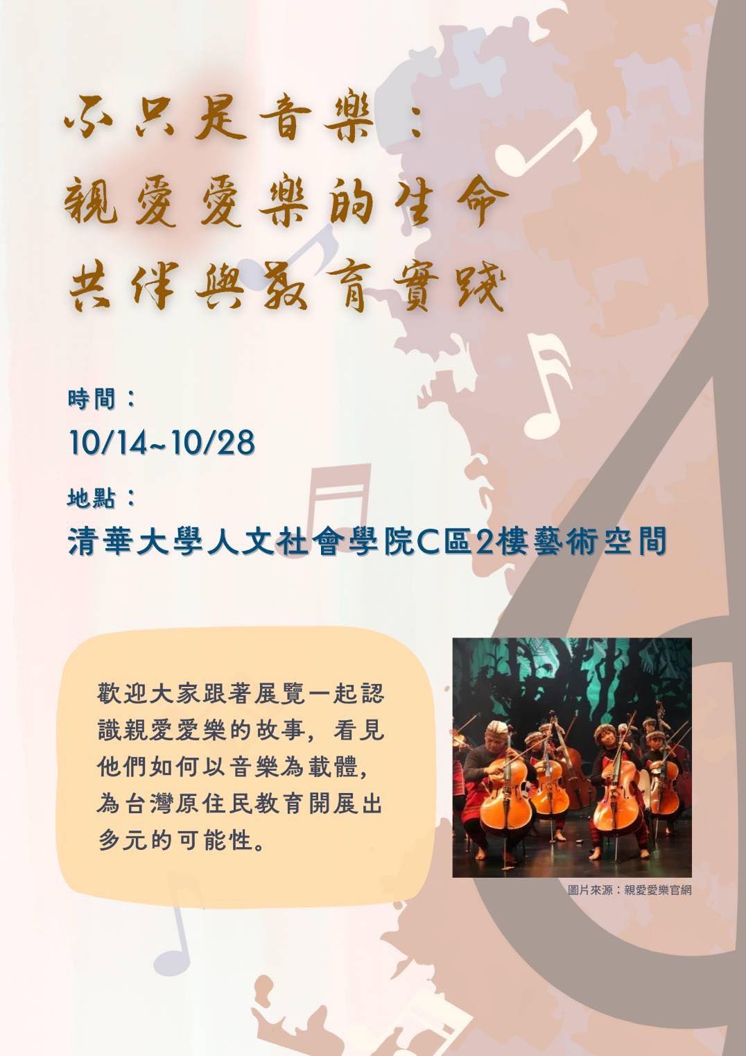 大家好,我們是「113-2 臺灣南島社會與文化」課程的學生,以本次的「不只是音樂:親愛愛樂的生命共伴與教育實踐」推廣展作為期末成果。邀請大家一起來認識親愛愛樂的故事,認識台灣原住民教育多元的可能性。